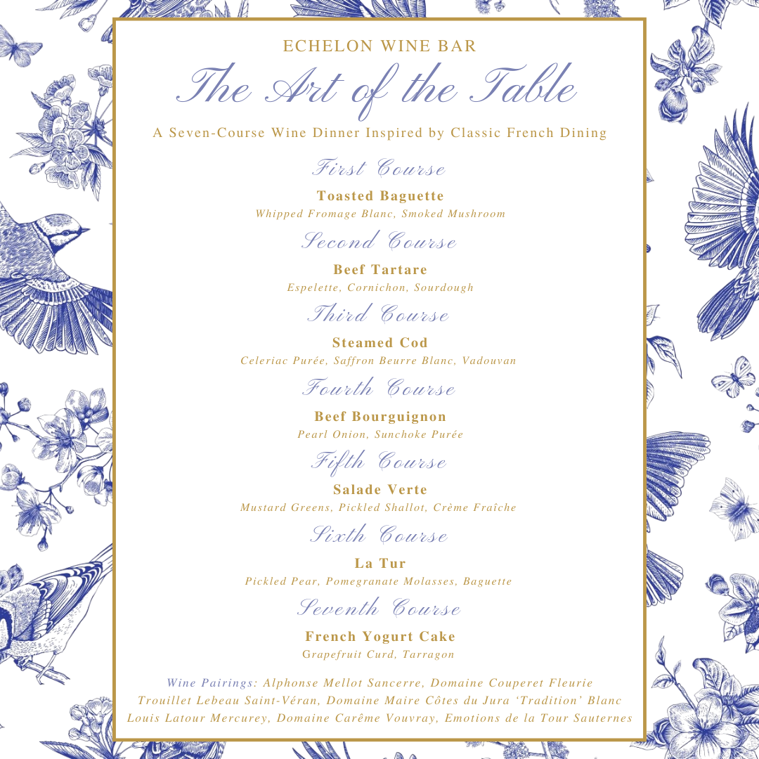 A seven-course wine dinner inspired by classic French dining. Thoughtfully crafted dishes are paired with iconic French wines.